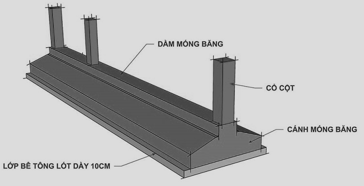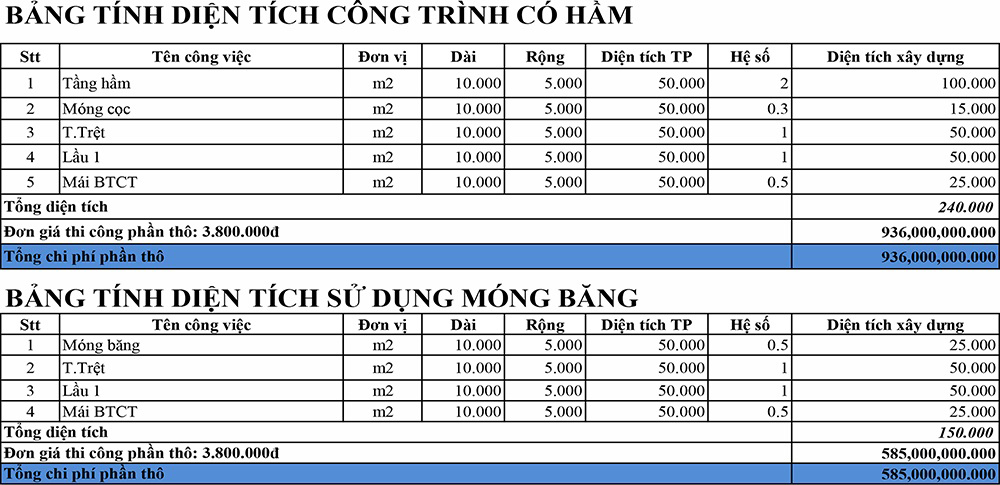 - Công trình thi công móng băng, phần móng tính 50% diện tích tầng trệt, nếu sàn trệt có đổ BTCT tính 65% tầng trệt