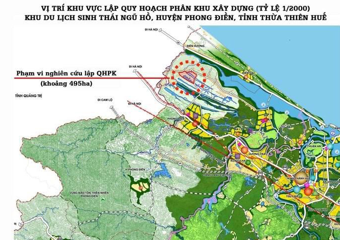 - Sở xây dựng tỉnh Thừa Thiên - Huế cho biết đã có văn bản gửi UBND huyện Phong Điền, UBND các xã Phong Chương, Phong Bình (huyện Phong Điền) về việc tổ chức lấy ý kiến cộng đồng về nhiệm vụ quy hoạch phân khu xây dựng khu du lịch sinh thái Ngũ Hồ thuộc địa bàn huyện này.- Theo đó, phạm vi lập quy hoạch thuộc địa bàn các xã Phong Chương và Phong Bình với diện tích khoảng 495ha. Khu vực lập quy hoạch có diện tích phần lớn là đất rừng sản xuất, đất nghĩa địa, đất mặt nước và đất chưa sử dụng. Ngoài ra, trong phạm vi nghiên cứu có khu vực khai thác cát của Công ty Cổ phần Khoáng sản và Đầu tư Khánh Hòa hiện tỉnh đã có chủ trương thu hồi và đưa vào quy hoạch dự trữ.