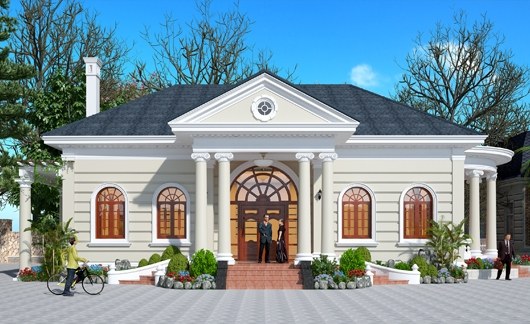 Mẫu biệt thự 1 tầng phong cách Pháp, kiến trúc mái thái có độc dốc cao và khối vòm trước mặt tiền, hệ thống đường gờ chỉ chạy ngang thân tường đem đến những hiệu ứng thẩm mĩ tươi mới và có sức hút lớn cho công trình. Với thiết kế mặt tiền cao ráo, thông thoáng cùng với sân trước rộng mở, hệ thống trụ cột tròn ôm trọn 3 phía của ngôi nhà, mang đến một cảm giác vững chắc và an toàn cho chủ đầu tư.