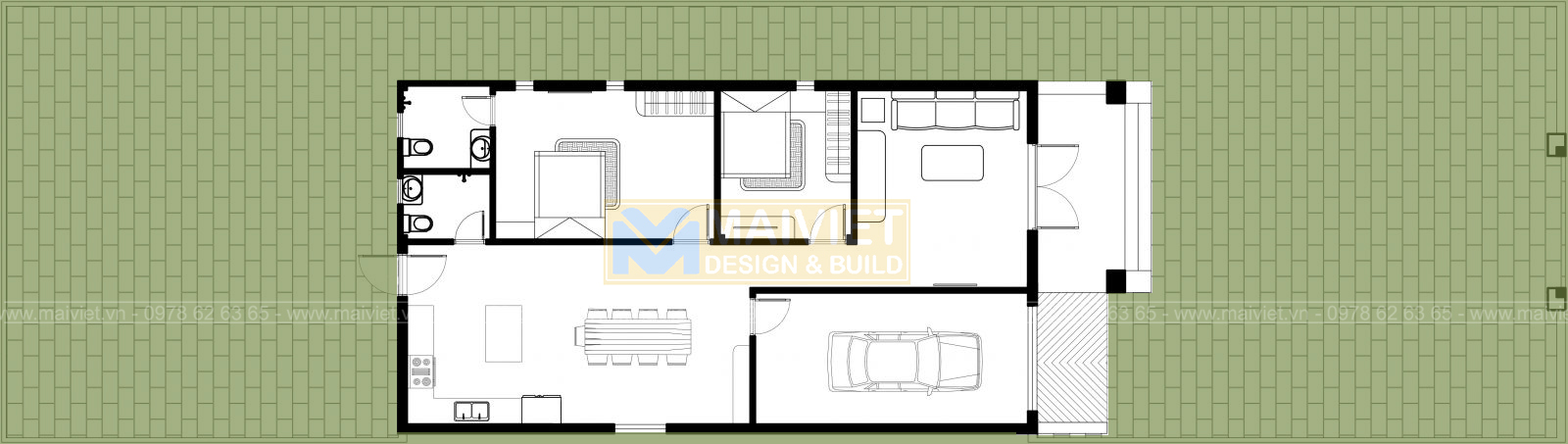 - Công trình được thiết kế với diện tích 8x13m trên khuôn viên đất 10x70m với quy mô Gara - phòng khách - bếp, phòng ăn - 02 phòng ngủ và 02 nhà vệ sinh