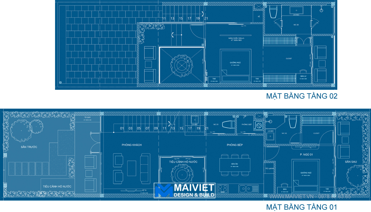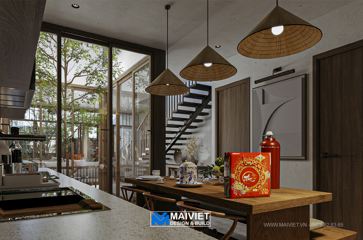 Tầng trệt là khu vực sinh hoạt chung với phòng khách liền bếp, đón trọn ánh sáng và gió trời qua những ô cửa rộng. Tầng trên là không gian nghỉ ngơi dành riêng cho gia chủ, được bố trí tối giản nhưng vẫn đầy đủ tiện nghi.