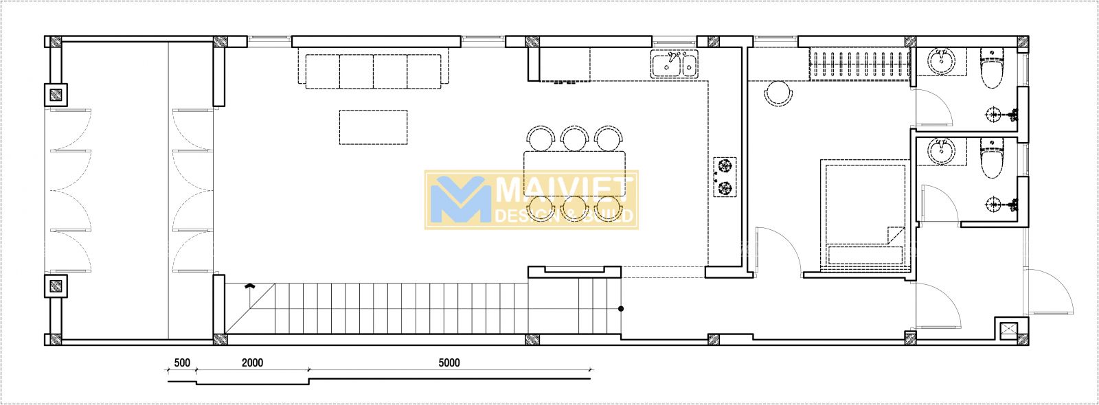 - Tầng 01 được bố trí với phòng khách liền bếp và Wc chung cho toàn tầng và 01 phòng ngủ dành cho ông bà với wc nội bộ.
