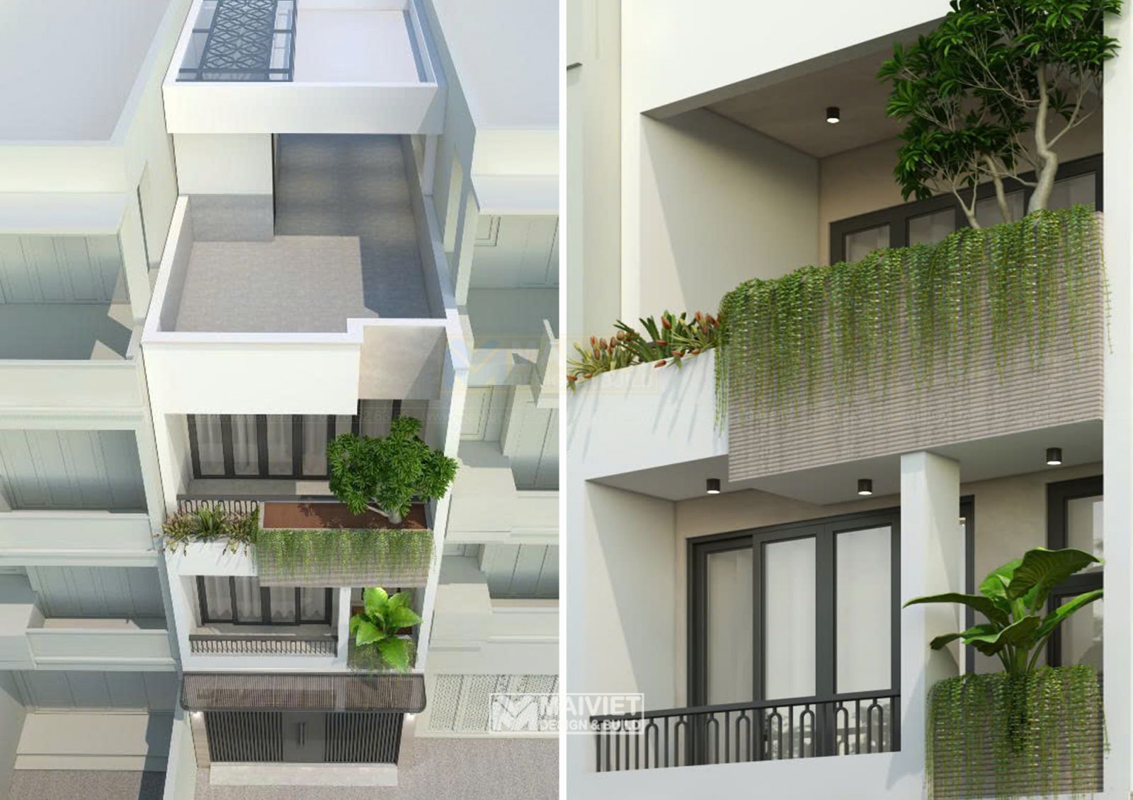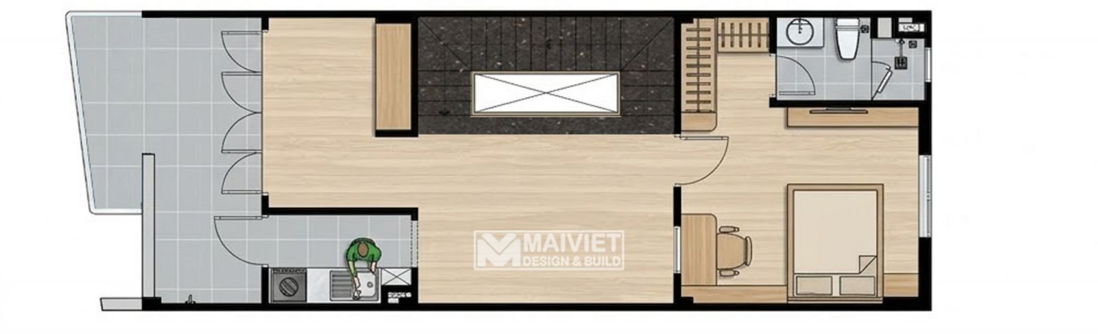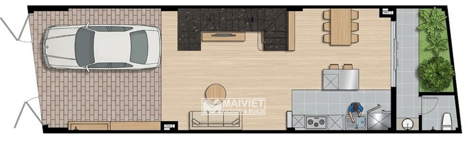 Điểm nhấn là khu vực sân vườn/giếng trời nhỏ phía sau cùng nhà vệ sinh, giúp đối lưu không khí và lấy sáng tự nhiên.