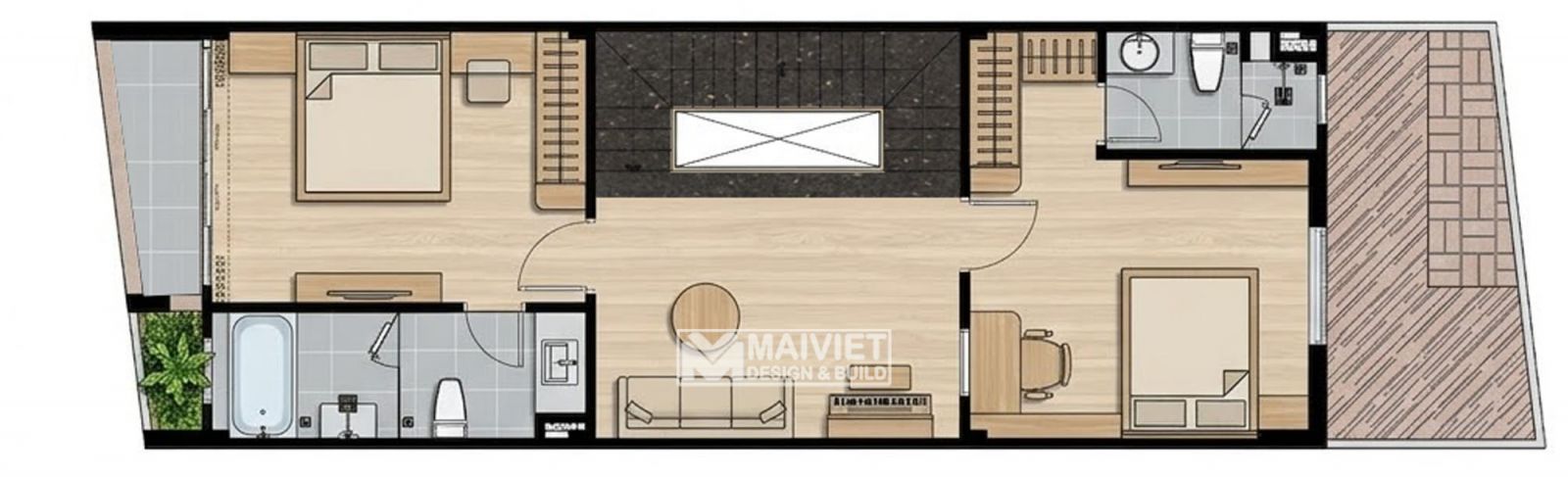 Giao thông thuận tiện: Cầu thang giữa đóng vai trò là trục giao thông đứng, giúp rút ngắn khoảng cách di chuyển giữa các phòng.
