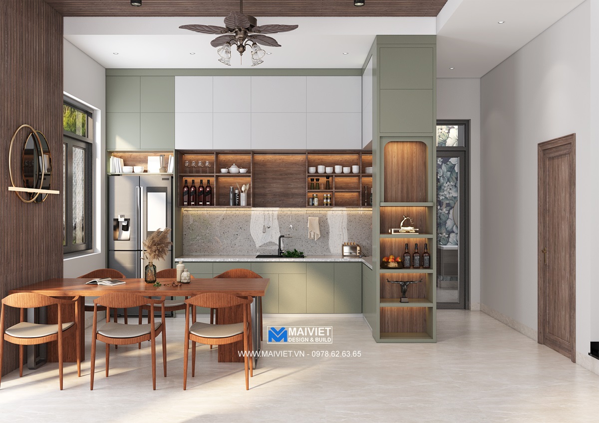 - Tầng 01 cửa biệt thự hiện đại 2 tầng được thiết kế với 01 phòng thờ nằm phía trước, bếp và không gian phòng khách liên thông nhau tạo thành một khu vực rộng và thoáng. Phòng ngủ bà phía sau với 1 wc khép kín, kho và wc chung đưa về cuối nhà với mái lấy sáng bằng kính phía trên.
