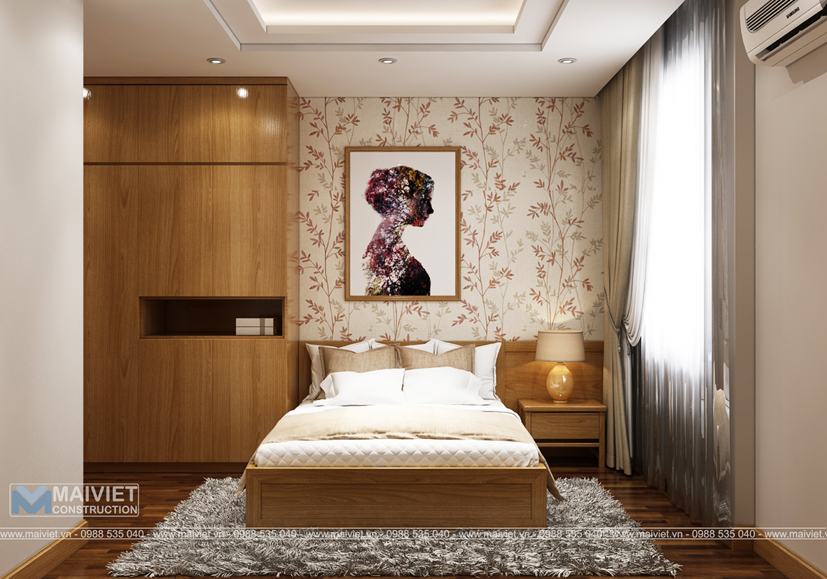Phòng ngủ master dùng sàn gỗ tông màu tối kết hợp với giấy dán tường tông sáng hòa quyện vào nhau mang lại cảm giác riêng tư , ấm cúng .