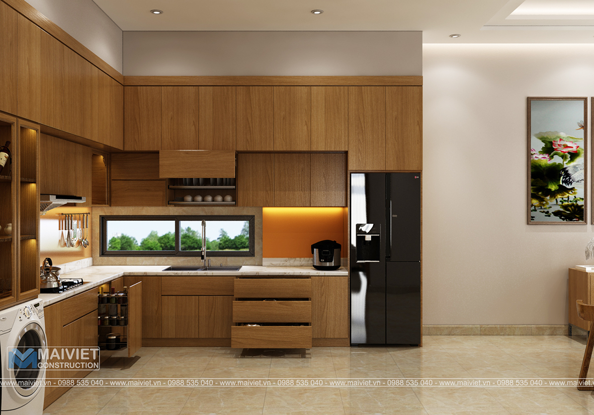 Nhà bếp của biệt thự kết hợp cửa sổ đôi giúp cho nhà bếp thông thoáng hơn , tạo cảm giác gần gũi với thiên nhiên .