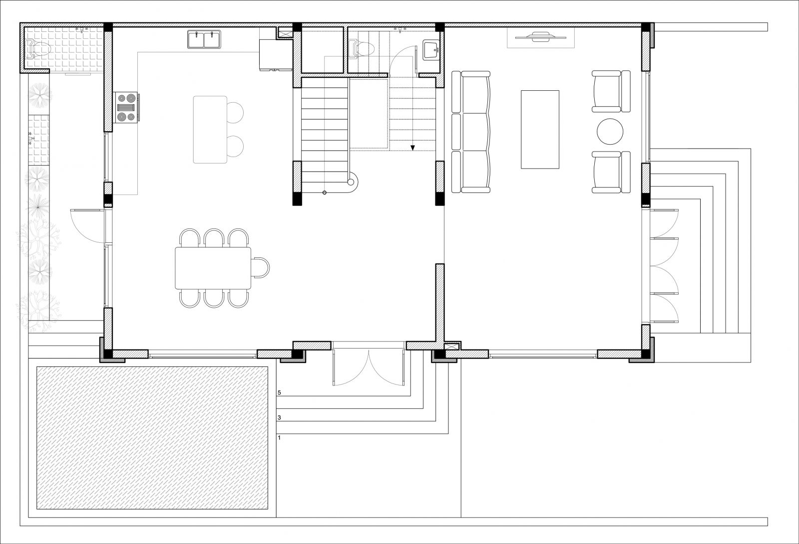 Tầng 01 bố trí với công năng chủ yếu dành cho phòng khách, bếp và phòng ăn. Khuôn viên chủ yếu dành cho việc trồng cây xanh và lối giao thông bên ngoài.