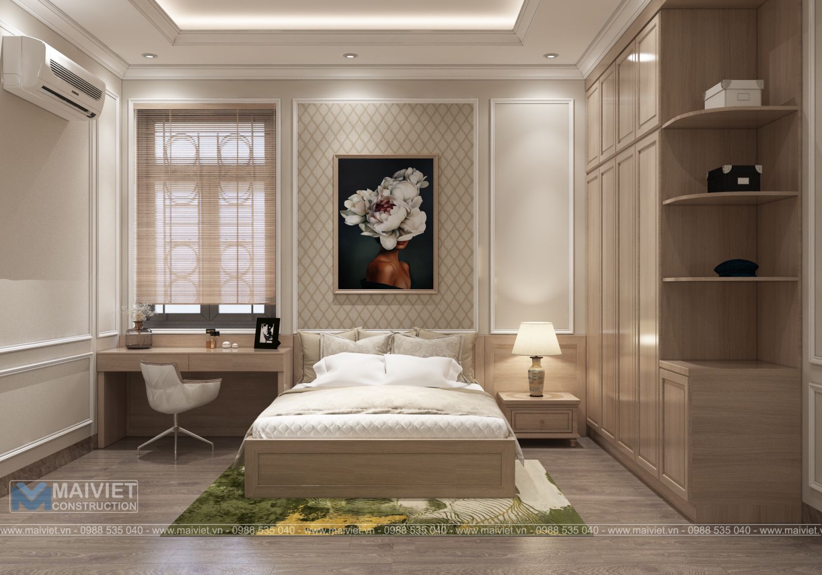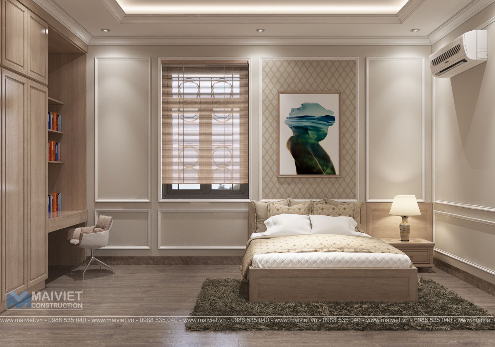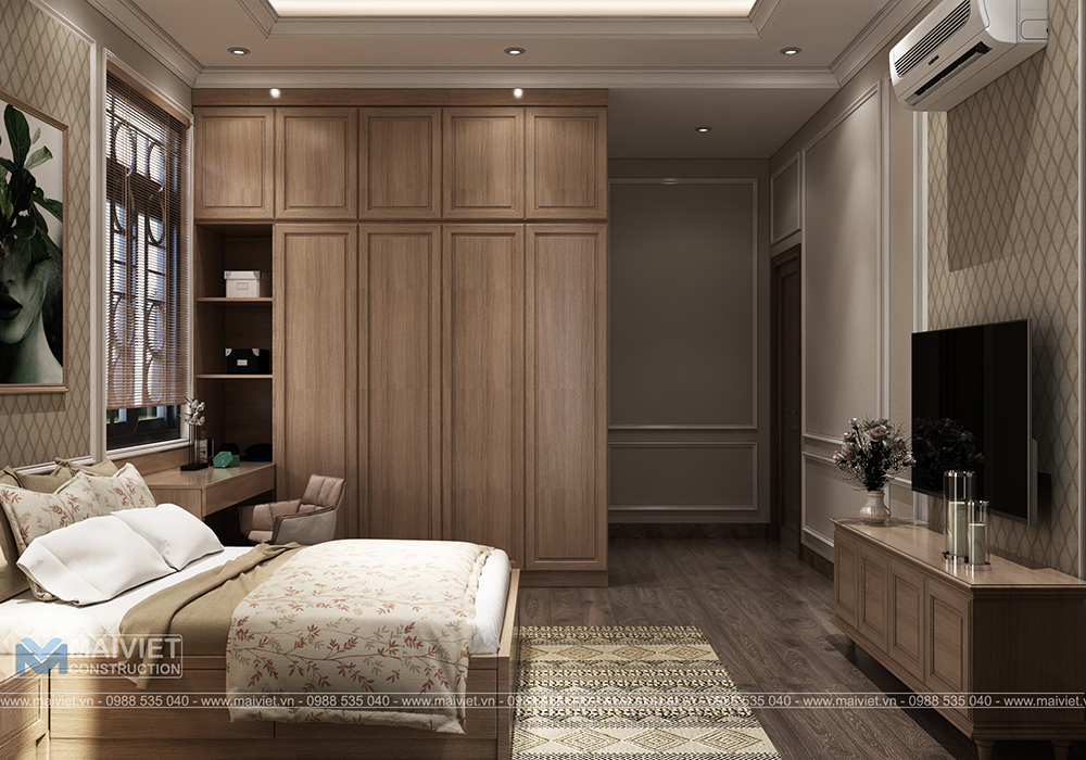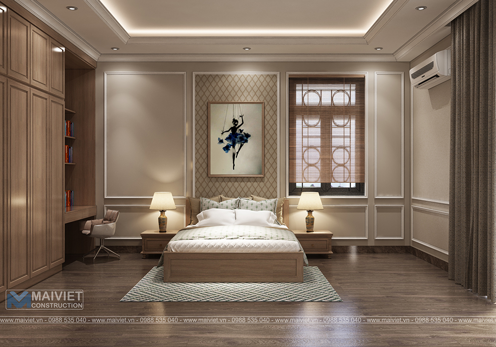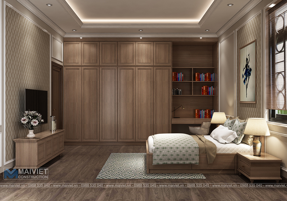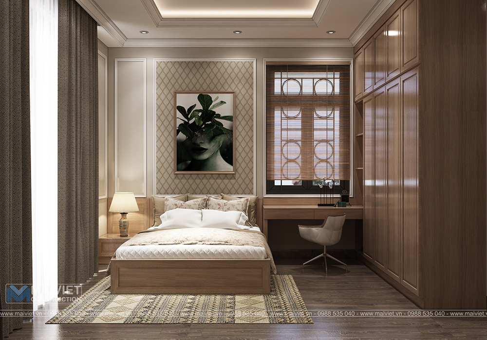 Toàn bộ đồ nội thất được làm bằng gỗ tự nhiên, phong cách nội thất các phòng chức năng cửa tầng 02 được thiết kế theoo phong cách bán cổ điển