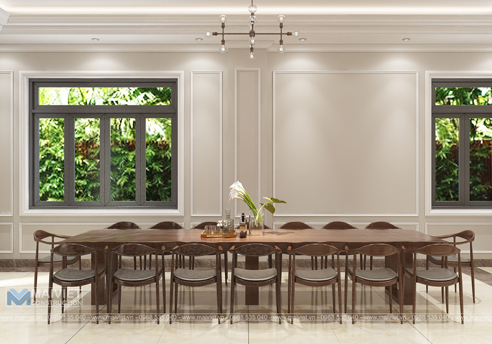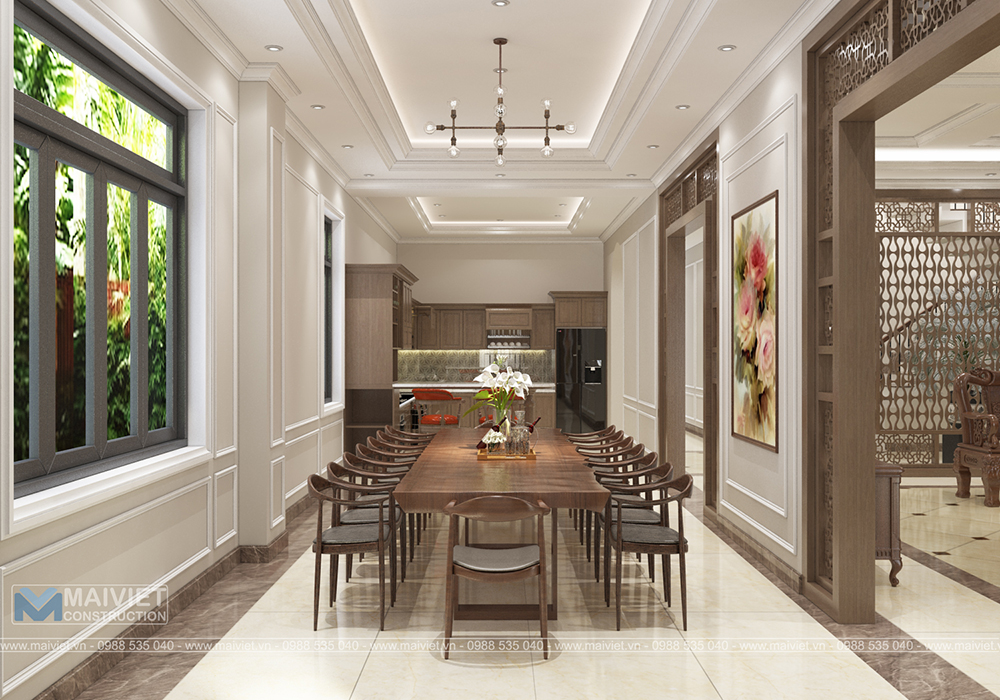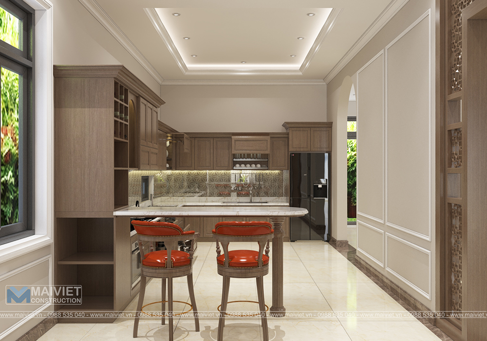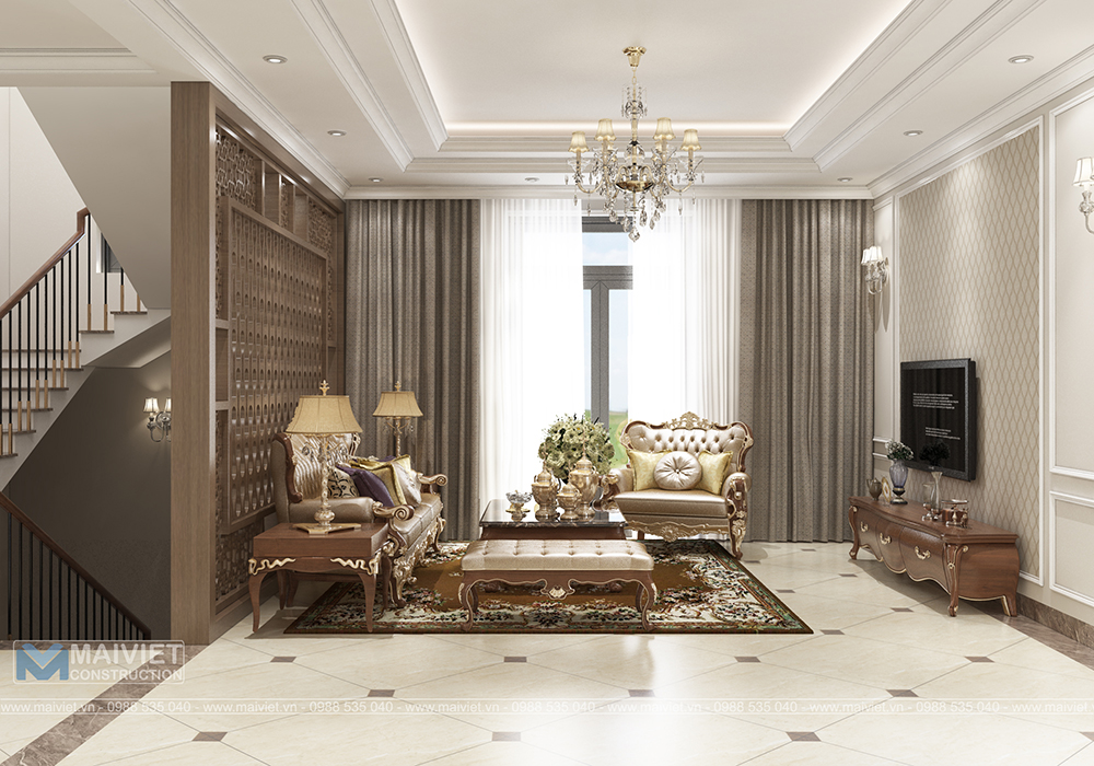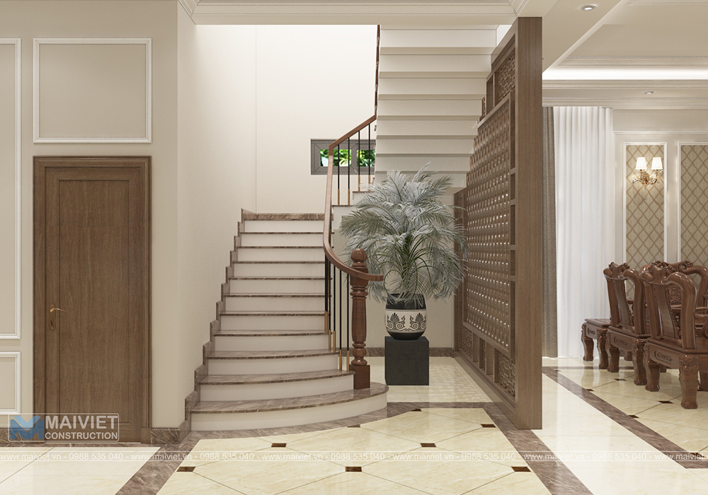 Phong cách nội thất cổ điển kết hợp giữa gỗ, đá và hệ phào chỉ tạo nên nét sang trọng và tinh tế cho không gian nội thất tầng trệt.