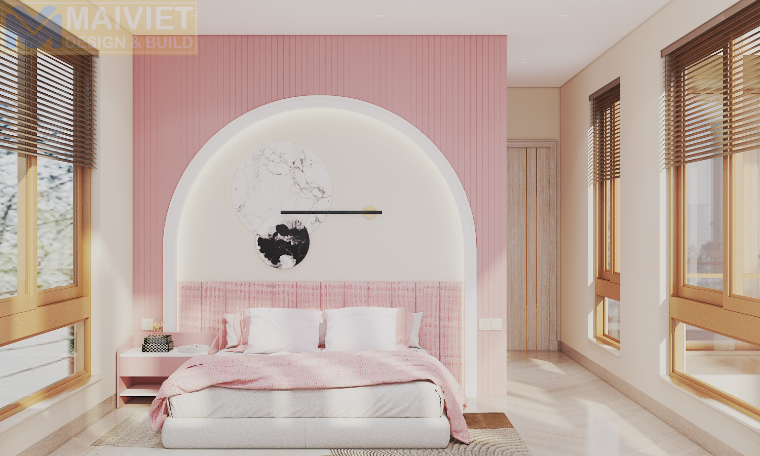 Đa dạng kết cấu: Để màu hồng không bị nhàm chán, chúng tôi đã ứng dụng nhiều kết cấu vật liệu: vách tường là lam gỗ sọc dọc sơn hồng, đầu giường bọc nệm cũng mang tông hồng với hoa văn dệt nổi. Sự đa dạng này tạo ra trải nghiệm thị giác và xúc giác phong phú.