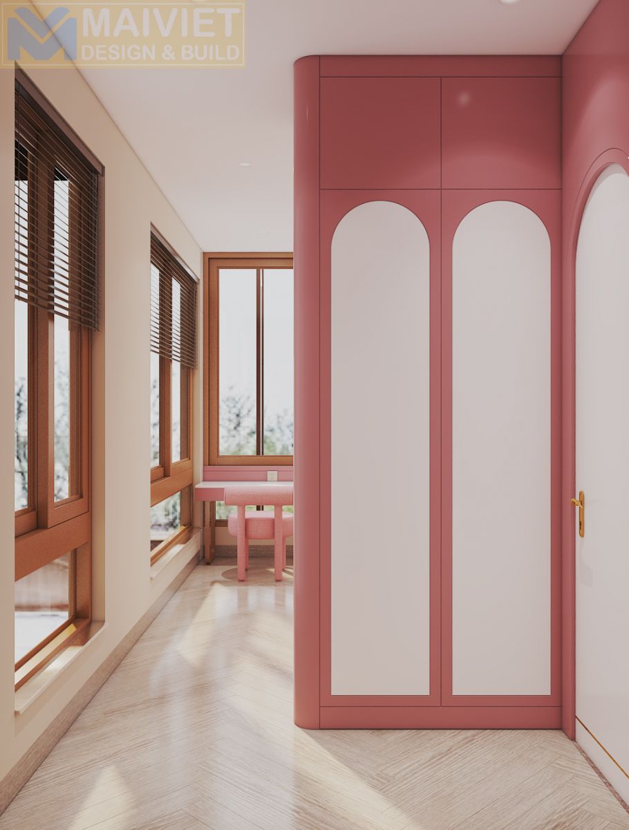 Cân bằng: Toàn bộ sự ngọt ngào này được cân bằng lại bởi sàn nhà sáng màu và hệ cửa sổ khung gỗ tự nhiên—một "chữ ký" kiến trúc xuyên suốt, kết nối căn phòng này với ngôn ngữ chung của cả ngôi nhà.