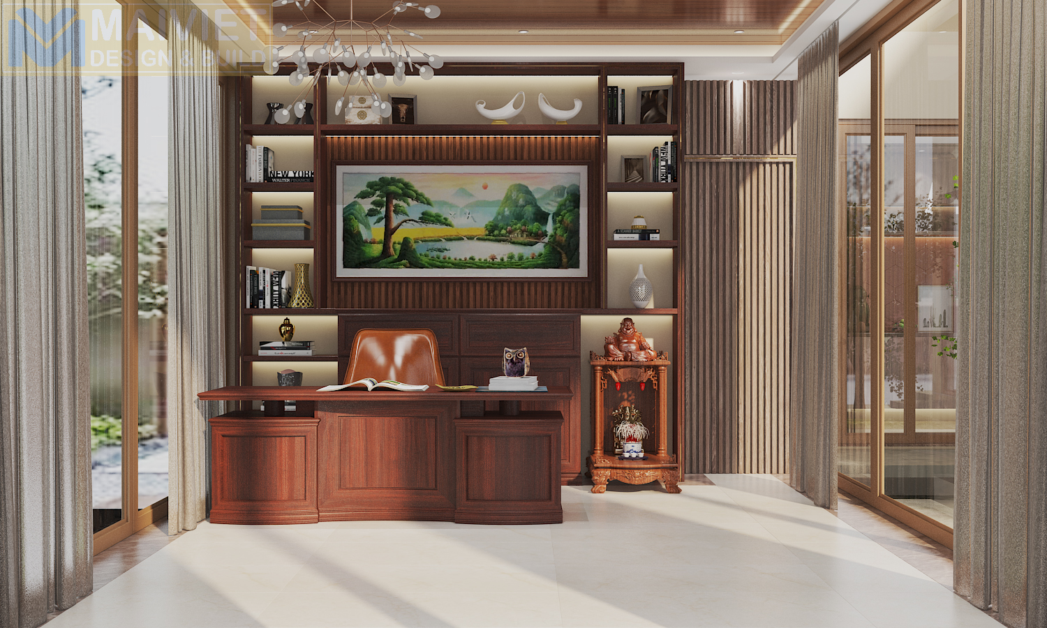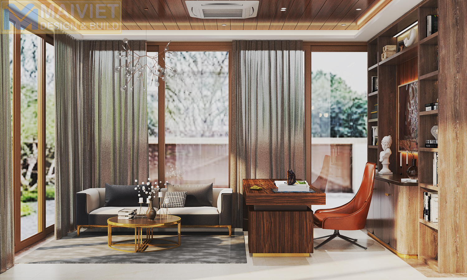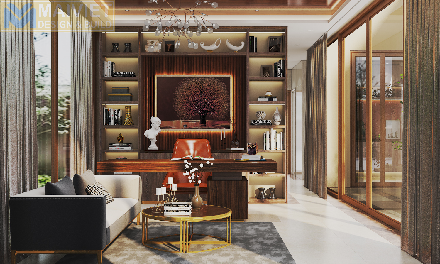 Chi tiết tinh xảo: Sự sang trọng được thể hiện qua các chi tiết nhỏ: chiếc ghế bọc da màu cognac nổi bật, các đường viền chân kim loại mạ vàng của bàn và sofa, hay hệ đèn chùm điêu khắc hiện đại. Đây là không gian của sự tập trung, nhưng cũng là nơi để tái tạo năng lượng.