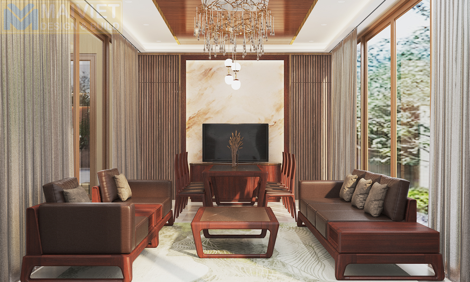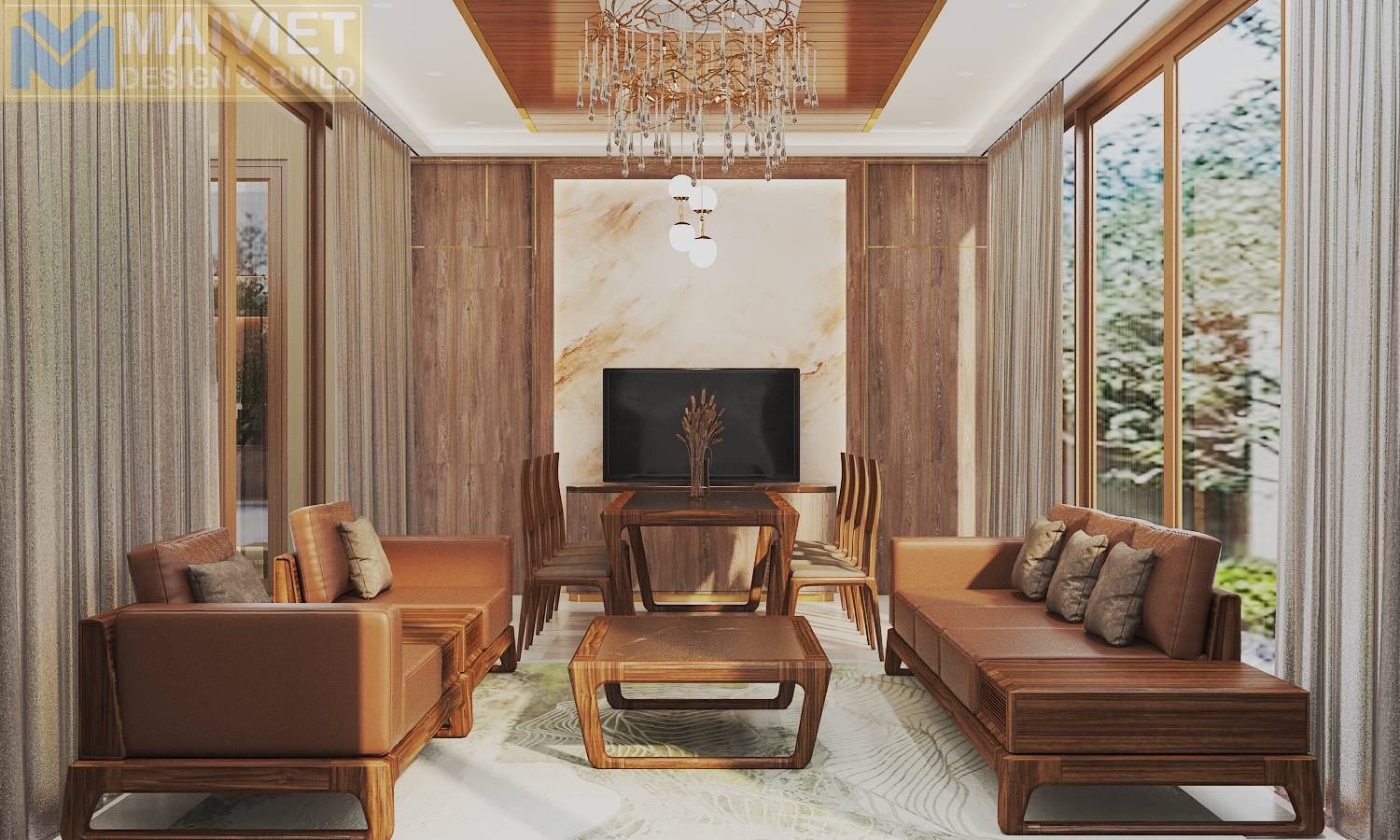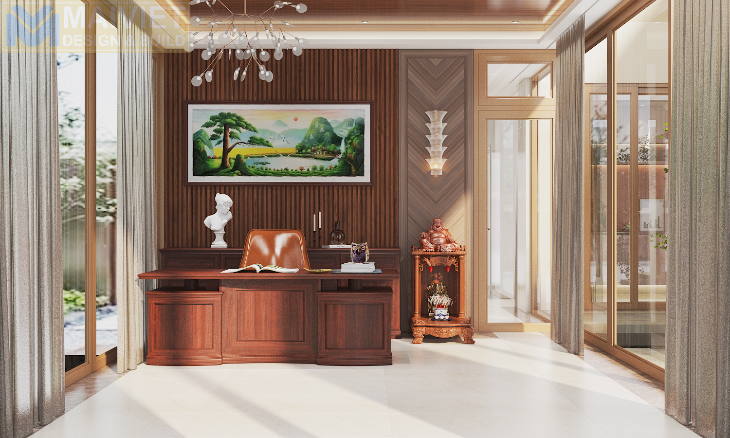Chi tiết tinh xảo: Sự sang trọng được thể hiện qua các chi tiết nhỏ: chiếc ghế bọc da màu cognac nổi bật, các đường viền chân kim loại mạ vàng của bàn và sofa, hay hệ đèn chùm điêu khắc hiện đại. Đây là không gian của sự tập trung, nhưng cũng là nơi để tái tạo năng lượng.
