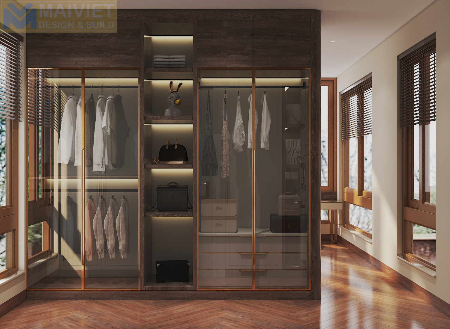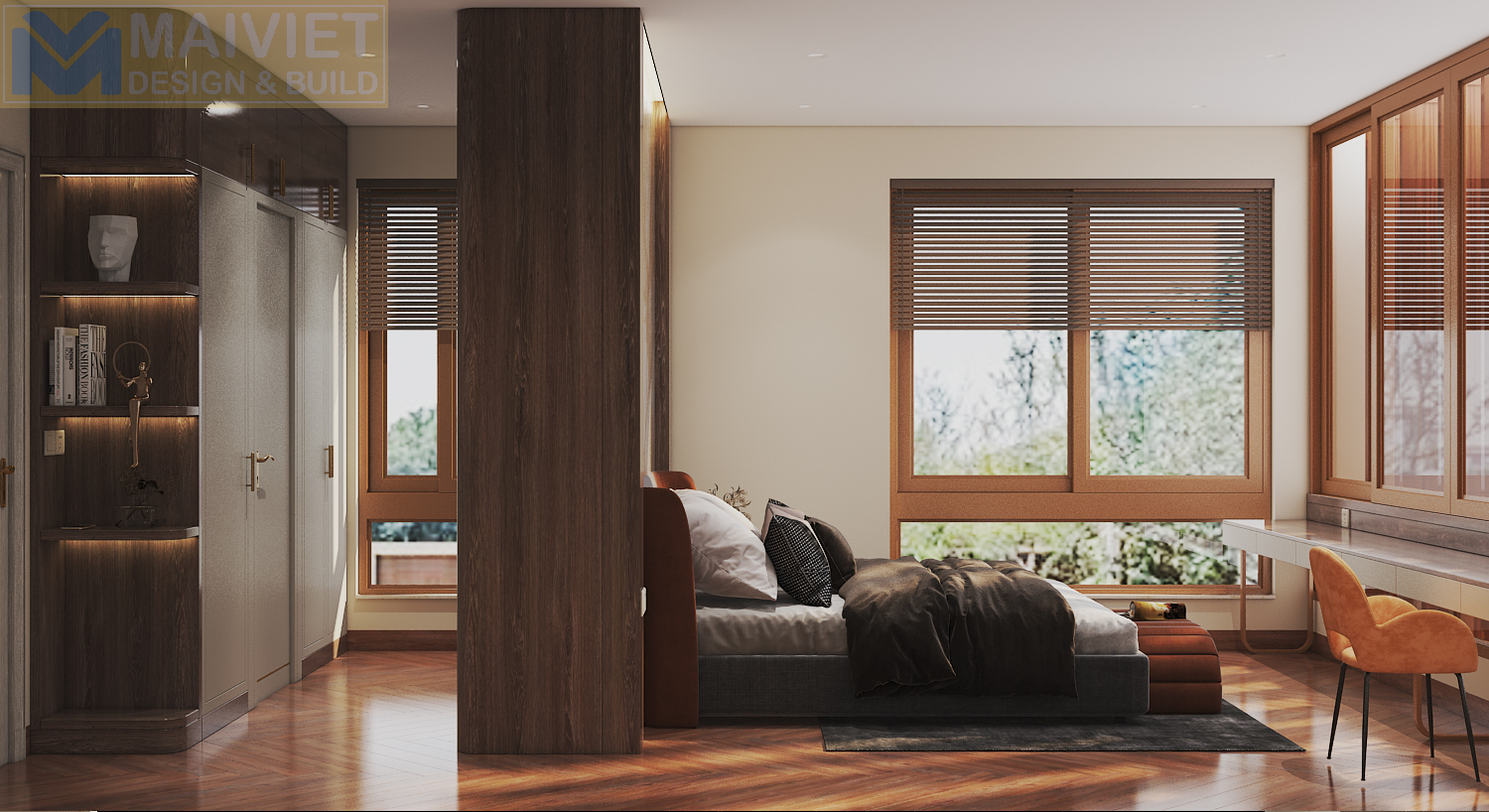Ánh sáng tự nhiên: Không gian phòng ngủ được ưu tiên tối đa ánh sáng tự nhiên. Các ô cửa sổ lớn ở cả hai phía bức tường không chỉ lấy sáng, mà còn mở ra tầm nhìn, giúp chủ nhân căn phòng kết nối với bên ngoài ngay khi thức giấc.