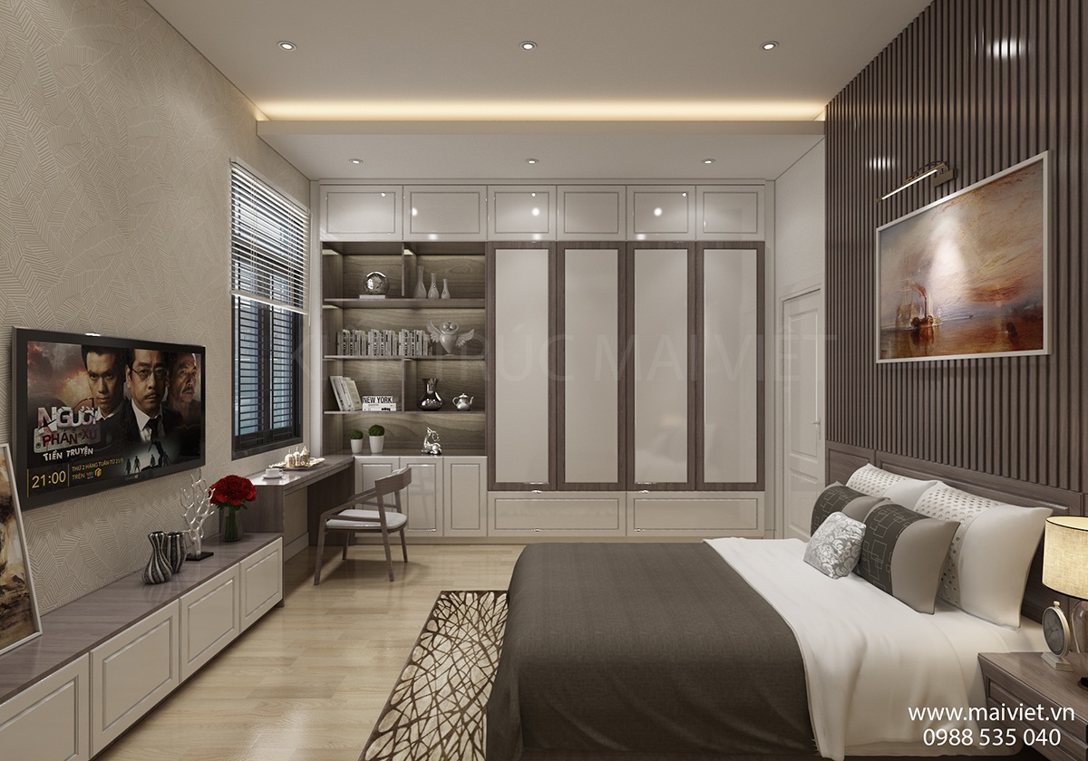 Quá trình thiết kế nội thất phòng ngủ hiện đại tập trung vào khai thác ánh sáng, bố cục của căn phòng cùng việc bố trí đồ nội thất hợp lí chính là chìa khóa giúp Kiến Trúc Mai Việt chúng tôi nhận được sự hài lòng từ khách hàng.