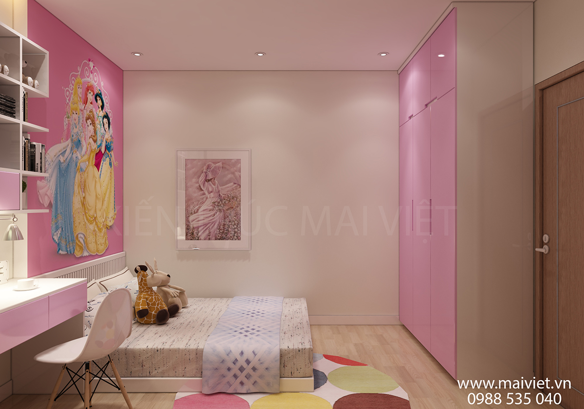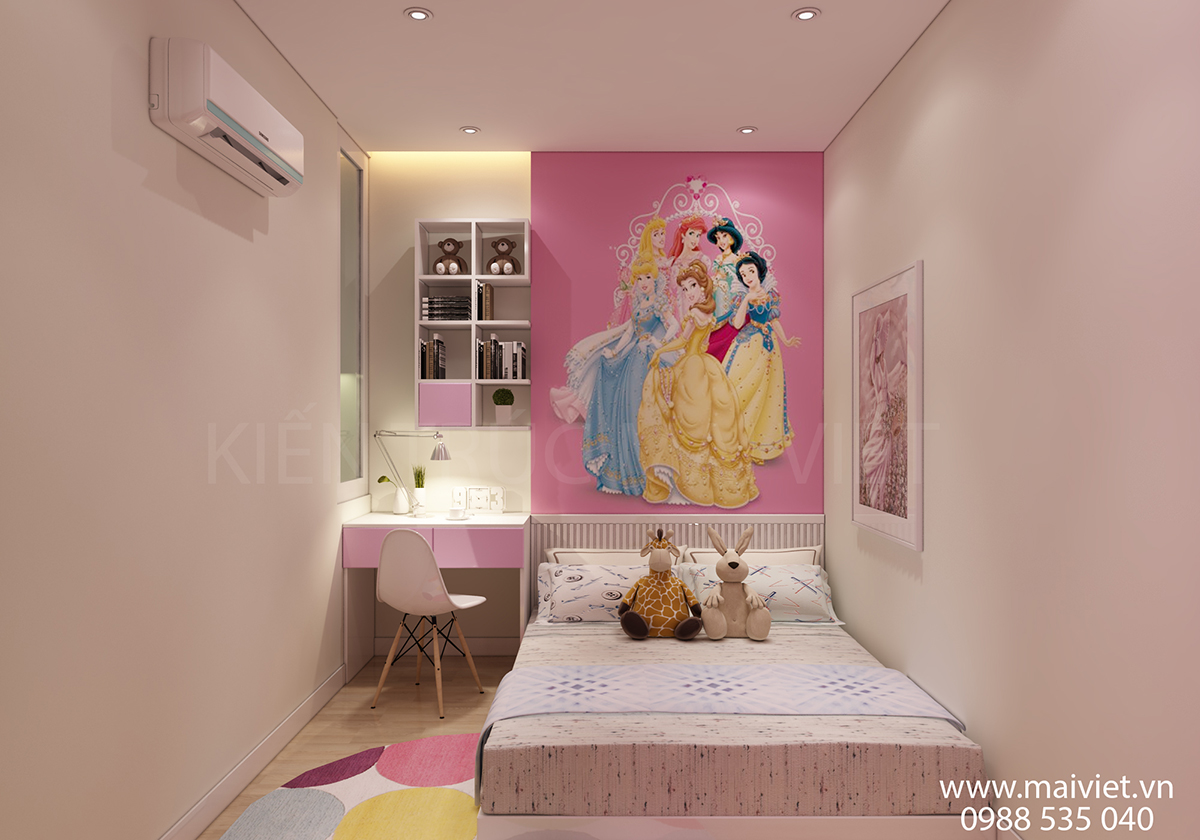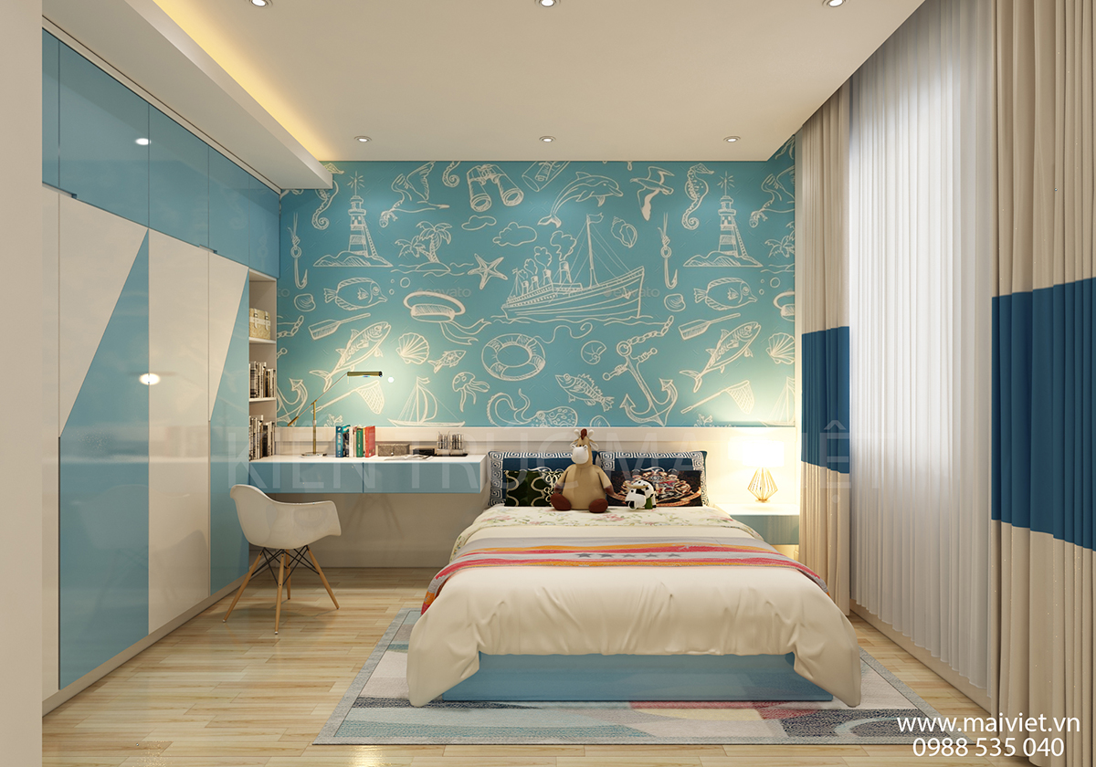 Không giống như con trai đơn giản và tiện dụng, phòng ngủ cô con gái không chỉ tiện dụng mà còn phải đẹp về thẩm mĩ. Gam màu chủ đạo xanh nhạt và trắng tinh tế, hiện đại, bắt mắt. Màu sắc nhẹ nhàng, phù hợp với tính cách và sở thích cô chủ nhỏ.